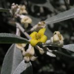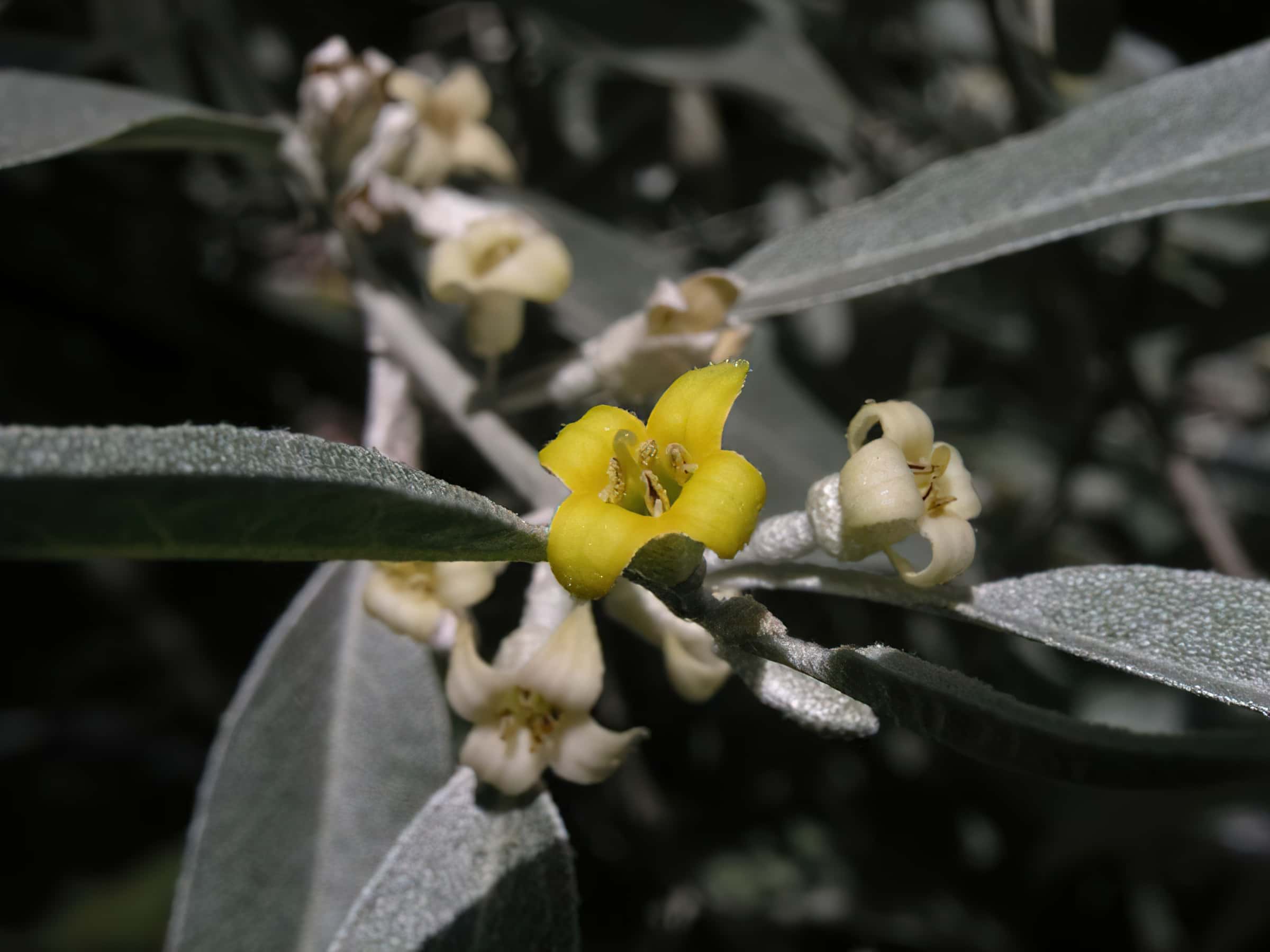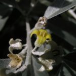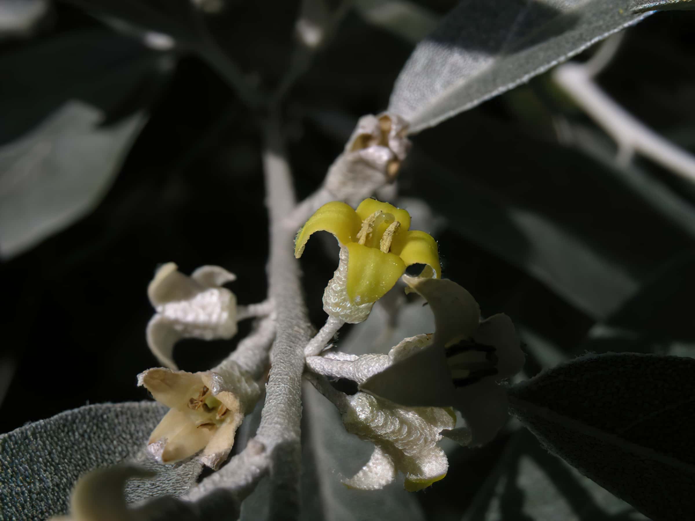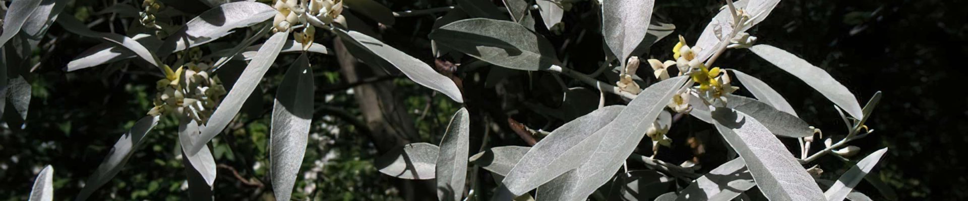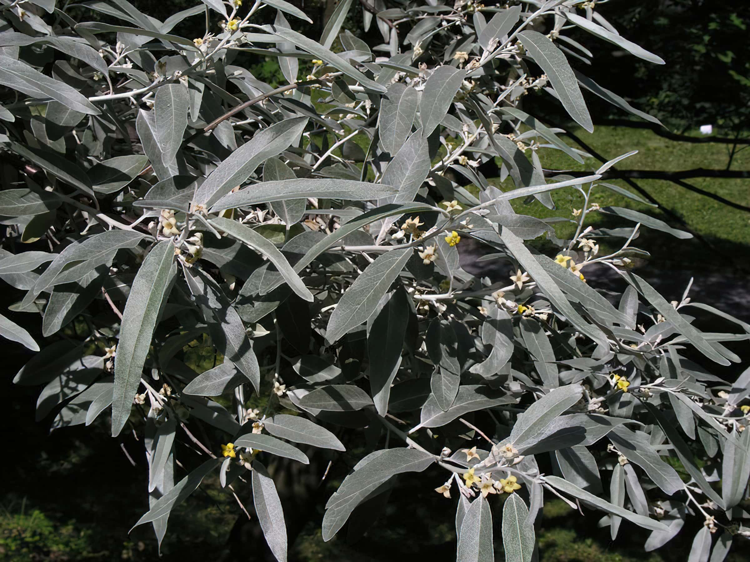 Strom nebo keř dosahující výšky až 12 m. Listy jsou střídavé, celokrajné, šedostříbřitě zelené, kopinaté, protáhlé, až 7,5 cm dlouhé, pokryté šupinovitými chlupy. Rostou na stříbrných, často ostnatých větévkách. Trny jsou 3 cm dlouhé. Kůra je červenohnědá, hrubá a trhá se.