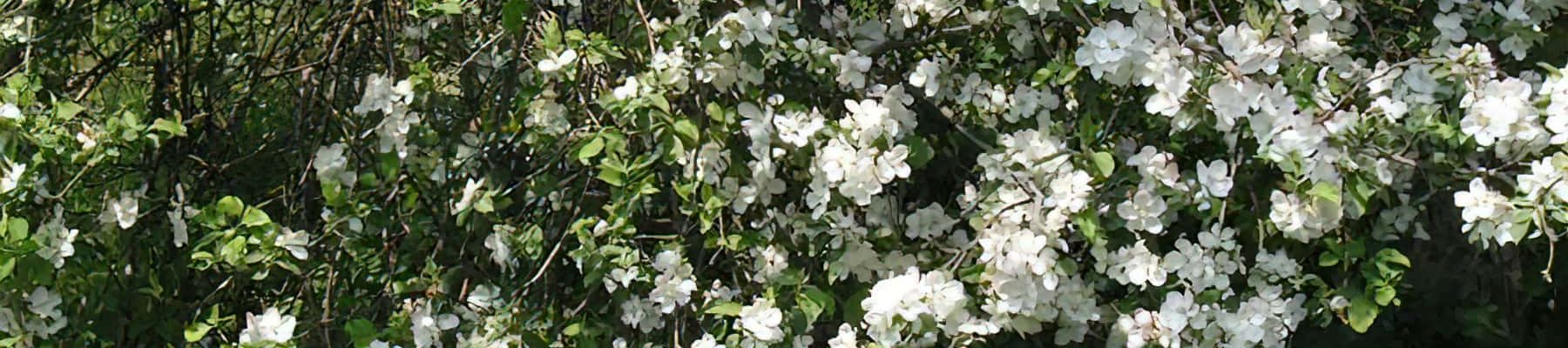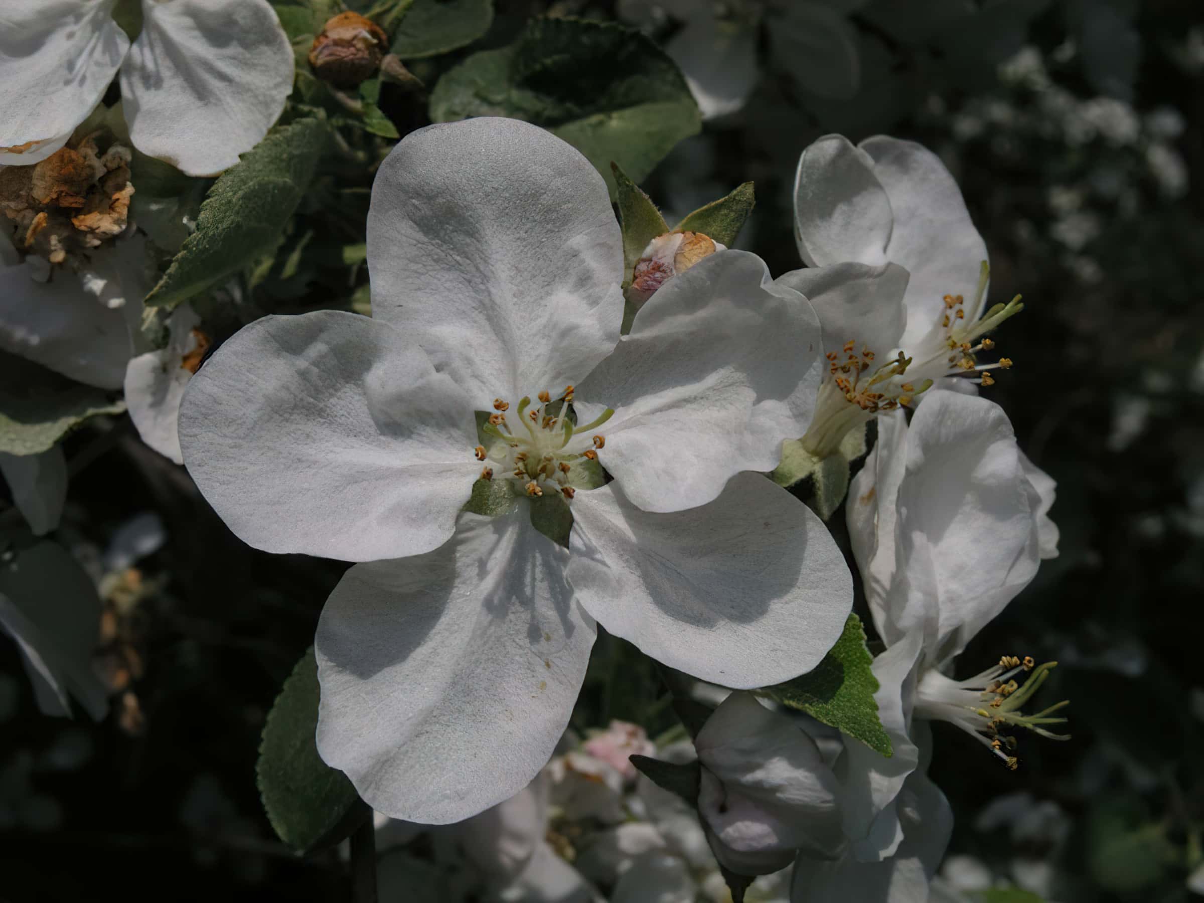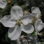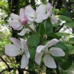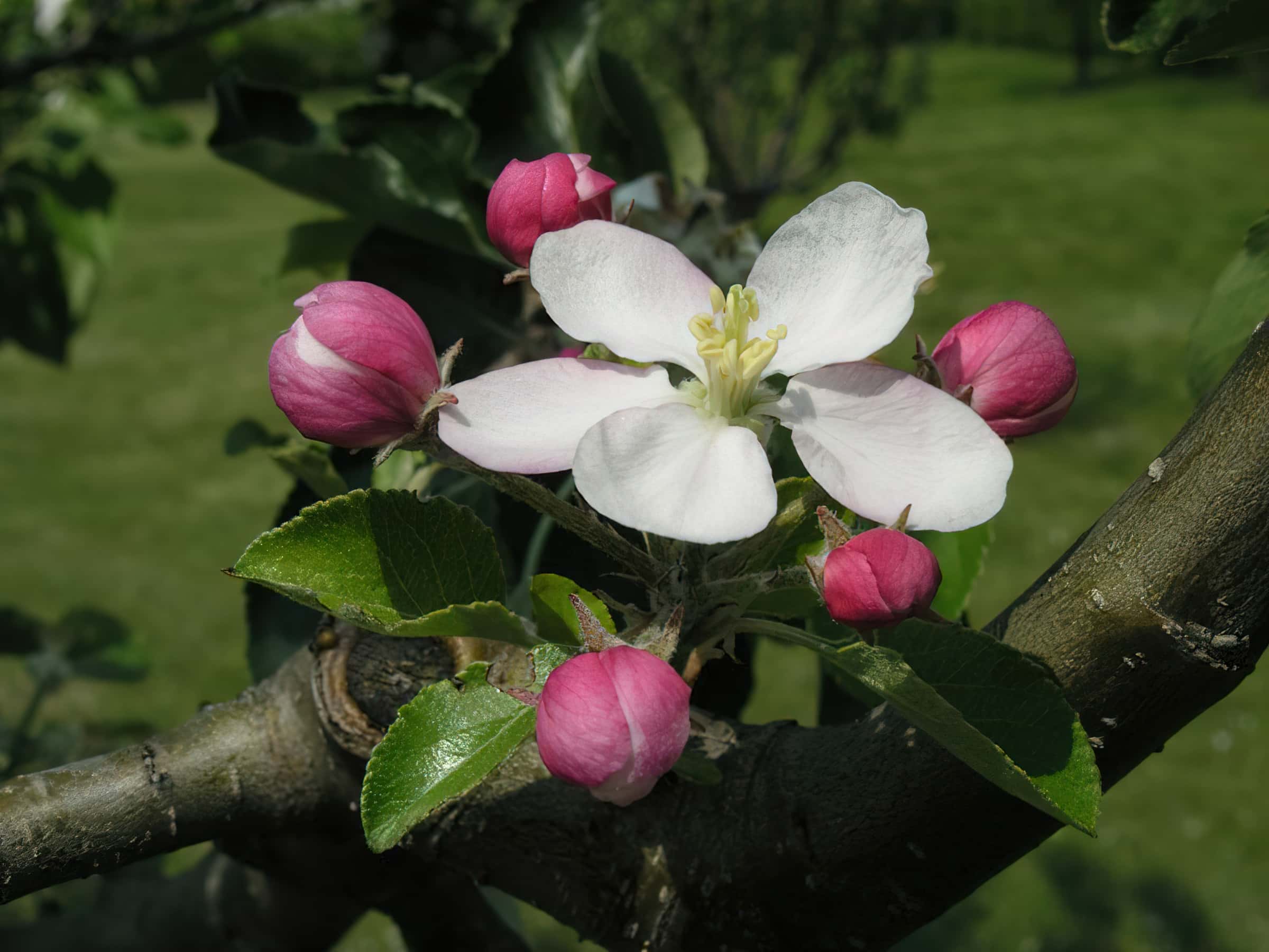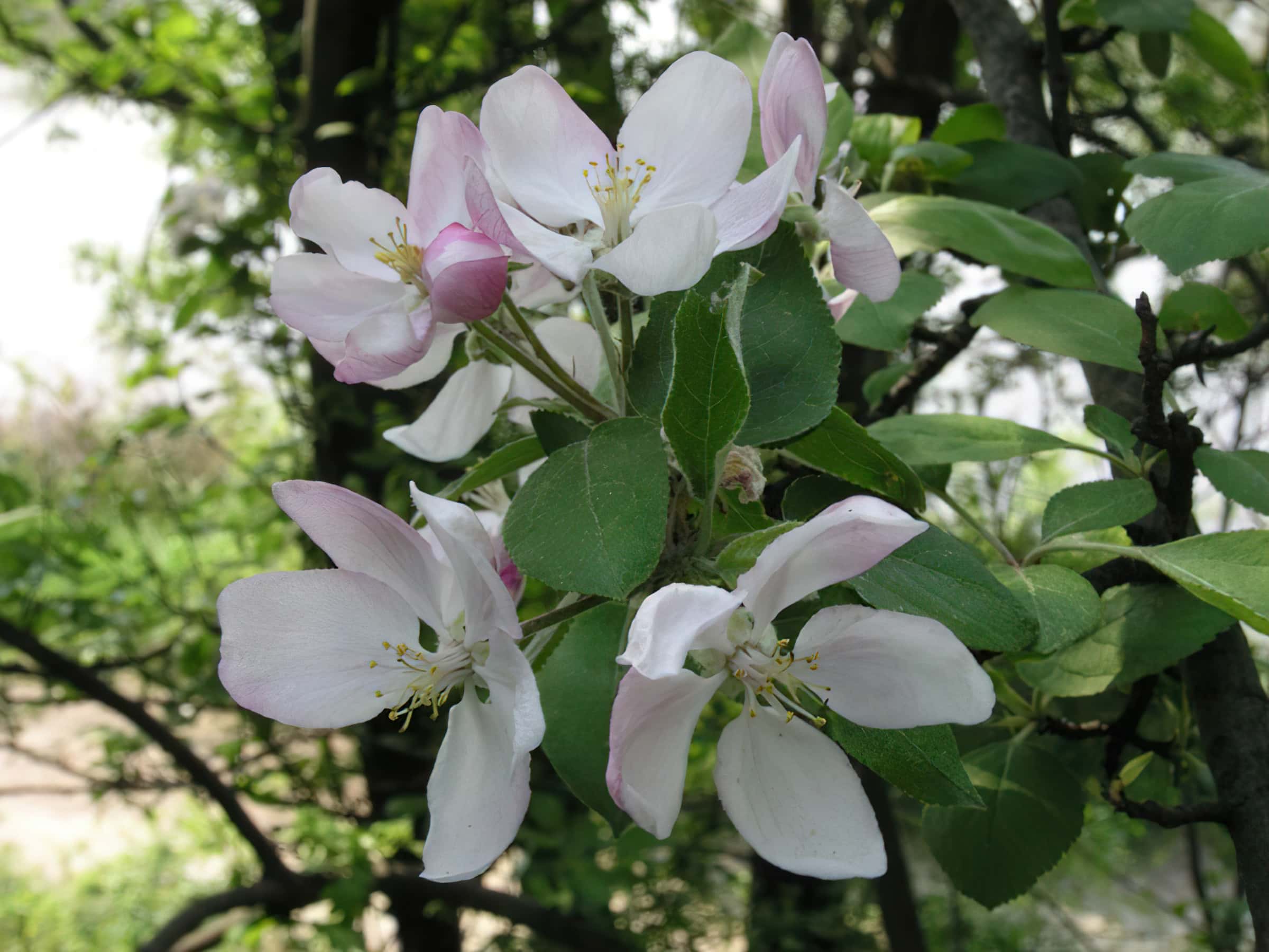 Kvete v dubnu až květnu. Květy jsou až 5 cm široké, bílé s vnějším červenavým nádechem, s 5 korunními lístky a 15–20 tyčinkami. Jabloň je cizosprašný strom. K opylení je nutný pyl z jiné odrůdy.