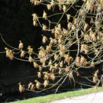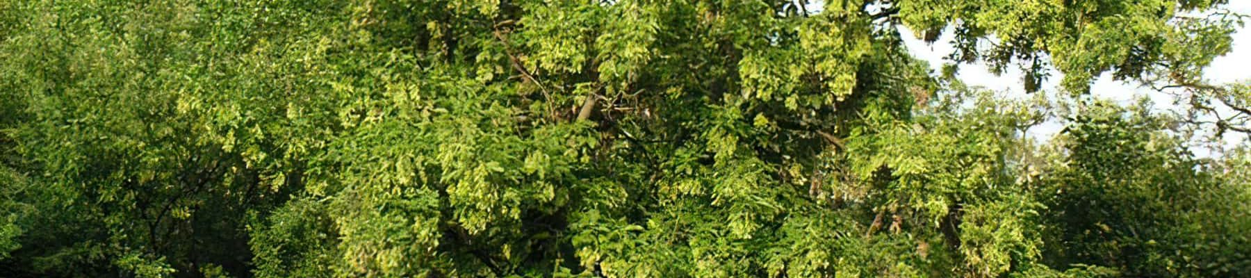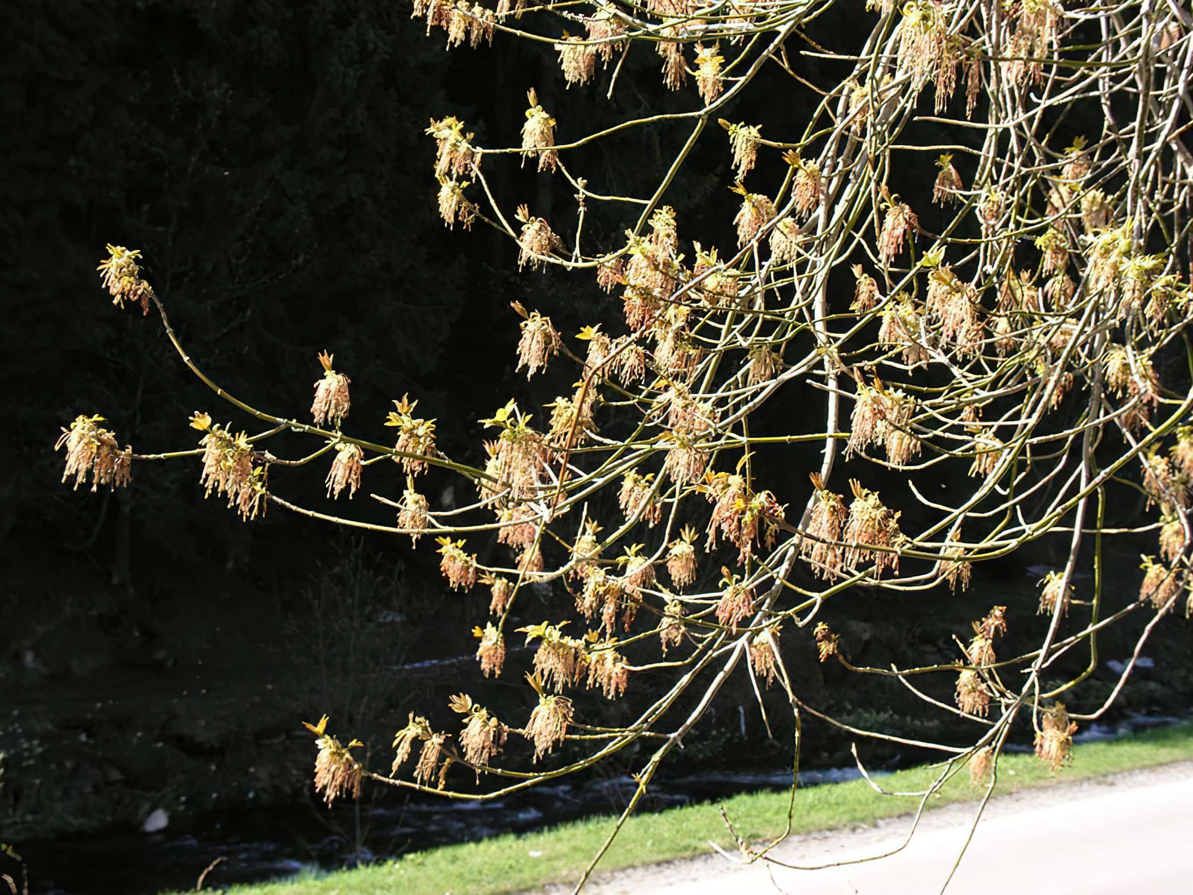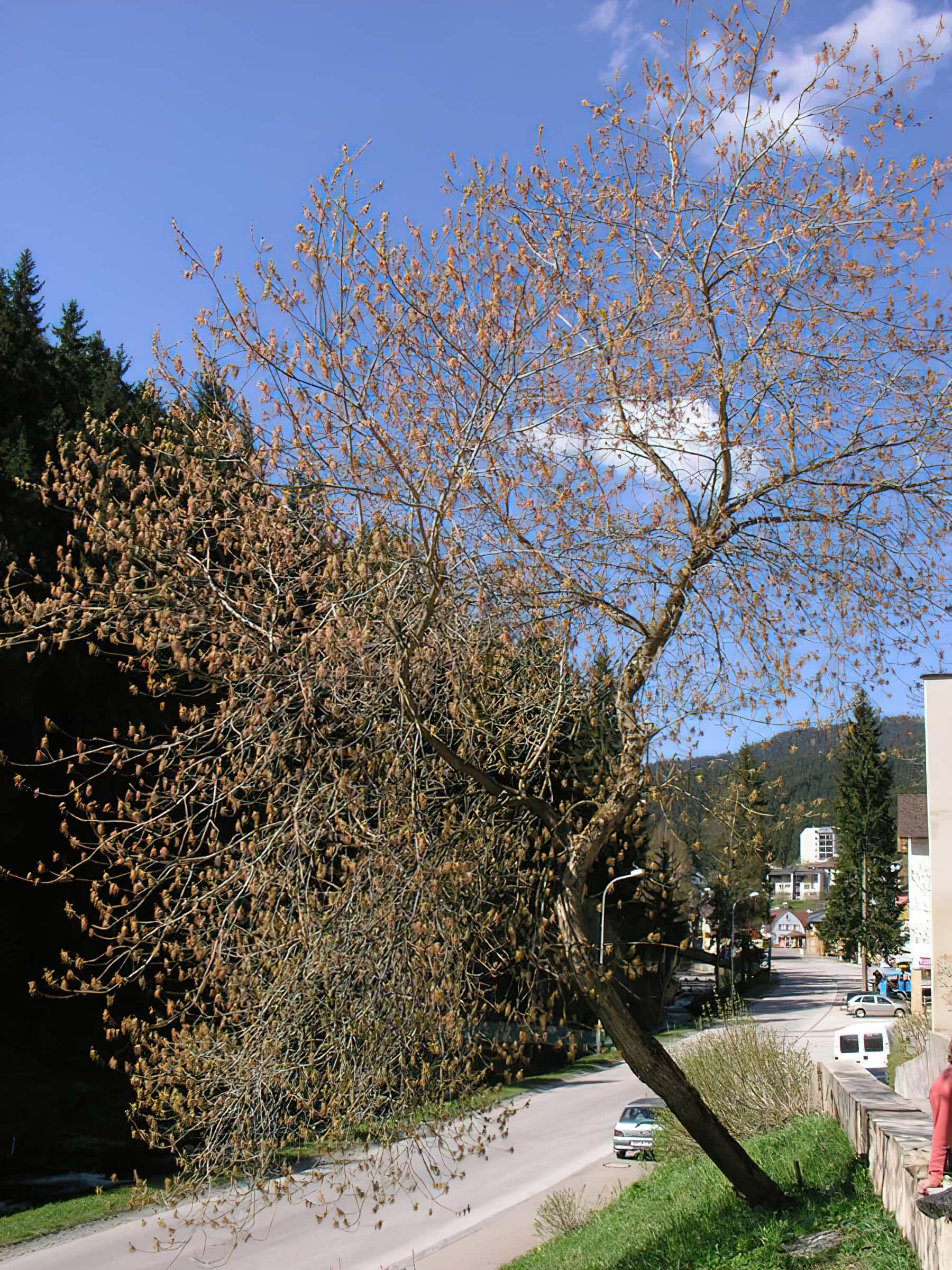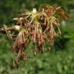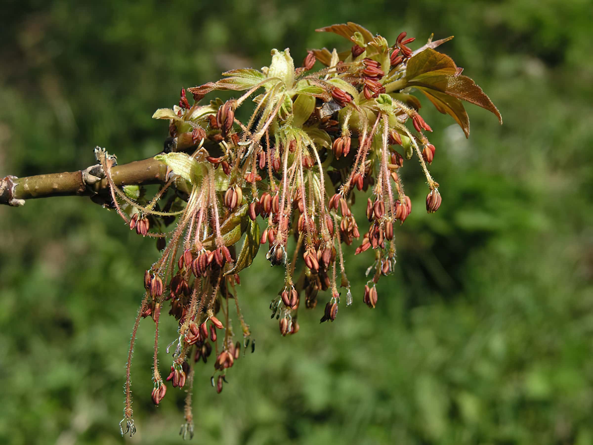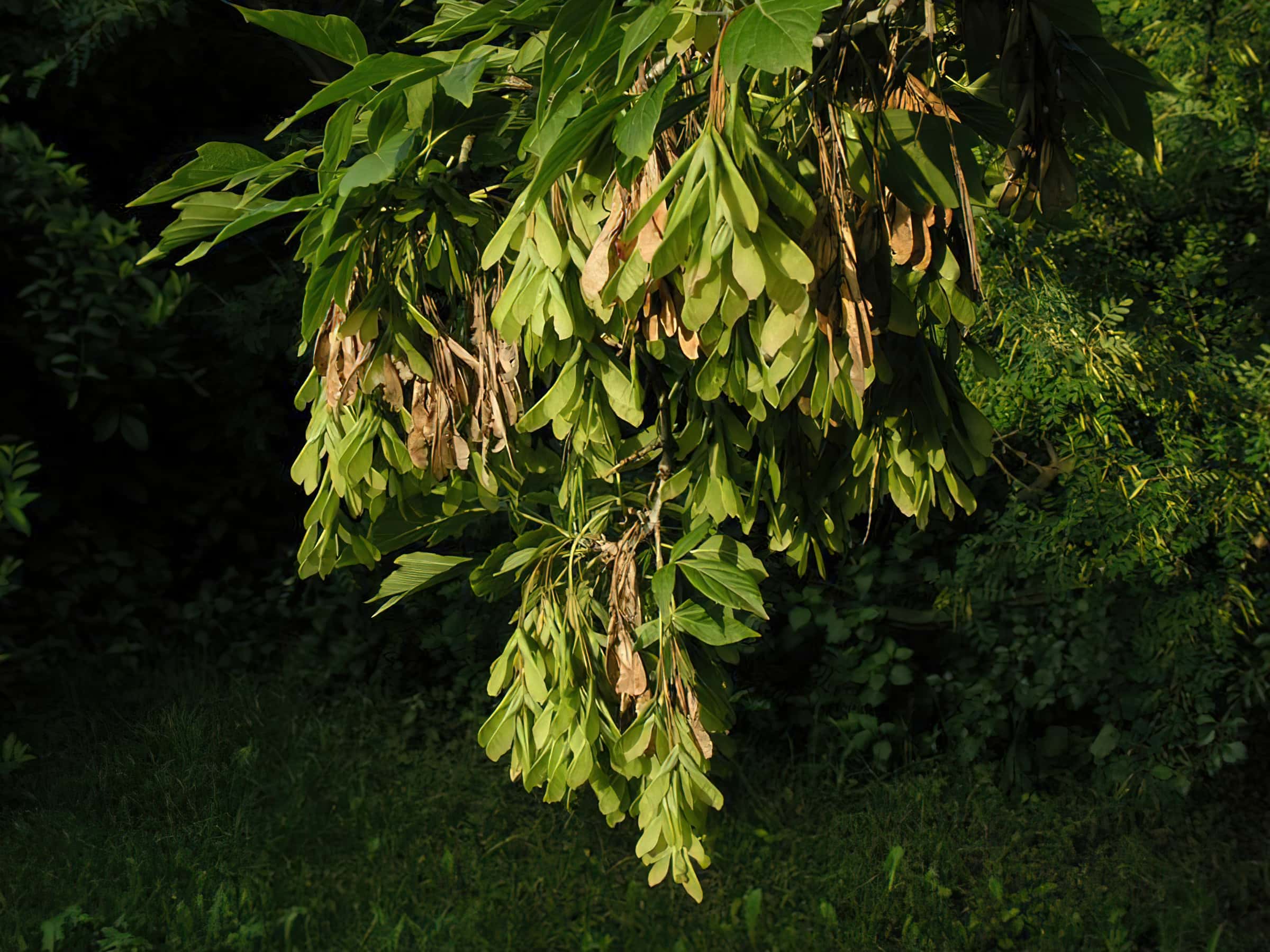Tento až 20 m vysoký, opadavý strom vytváří většinou poněkud neupravenou, světle zeleně zbarvenou a rozkladitou korunu. Letorosty mají svrchní pokožku zpočátku poněkud namodralou, později zelenou a nakonec hnědou. Listy tohoto javoru se nepodobají listům většiny javorů. Jsou sice vstřícné, ale lichozpeřené, 3- až 7četné, s řapíkatými, vejčitými, špičatými lístky o velikosti 5–13 cm, s nestejně zubatým okrajem.